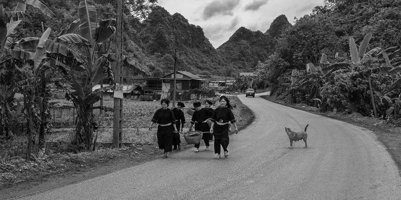 With karst mountains rising in the distance, the Nùng artisans carry the finished banana-silk cloth to wash in the mineral-rich water of a nearby cavern. Photo: Ben Reich.