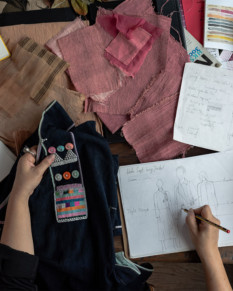 Back at her atelier in Hanoi, Thao works up a sketch for a new linen jacket. Photo: Courtesy Kilomet 109.